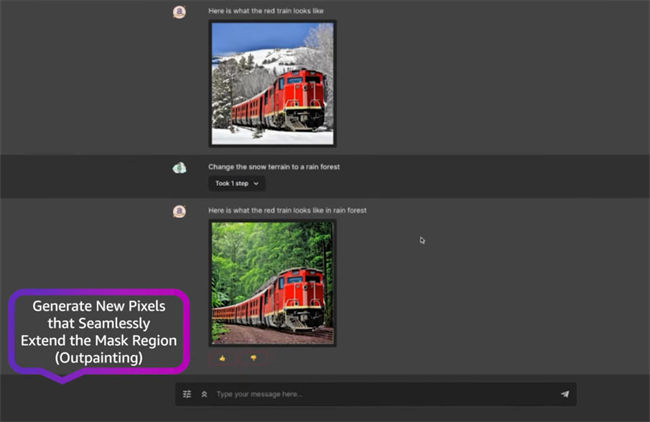 依 Amazon 的说明,用户可以仅靠文字无中生有地生出图片;也可以上传图片后,利用 AI 来进行编辑。 它在同一个聊天串当中,可以持续对照片内容进行修正,例如在范例影片中,先是将前景的房子换成了火车,再将背景的冰天雪地换成了绿色的树林。 AI 另外也能「向外填充」图片,以现有的图片为基础,补足空白的部份。